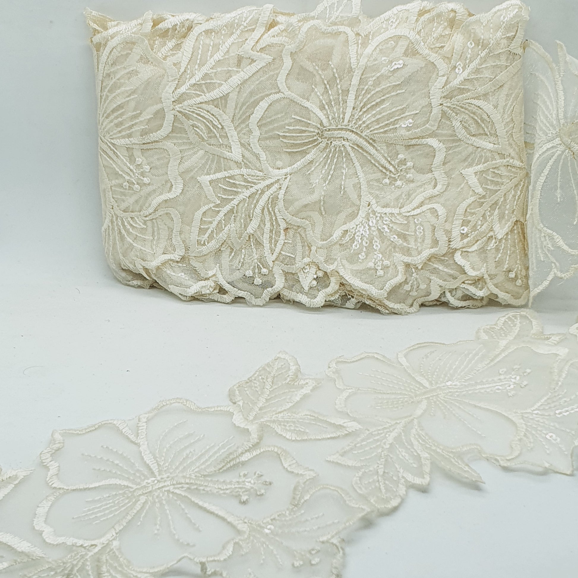 1m 14cm cream embroidered net floral lace with transparent sequins