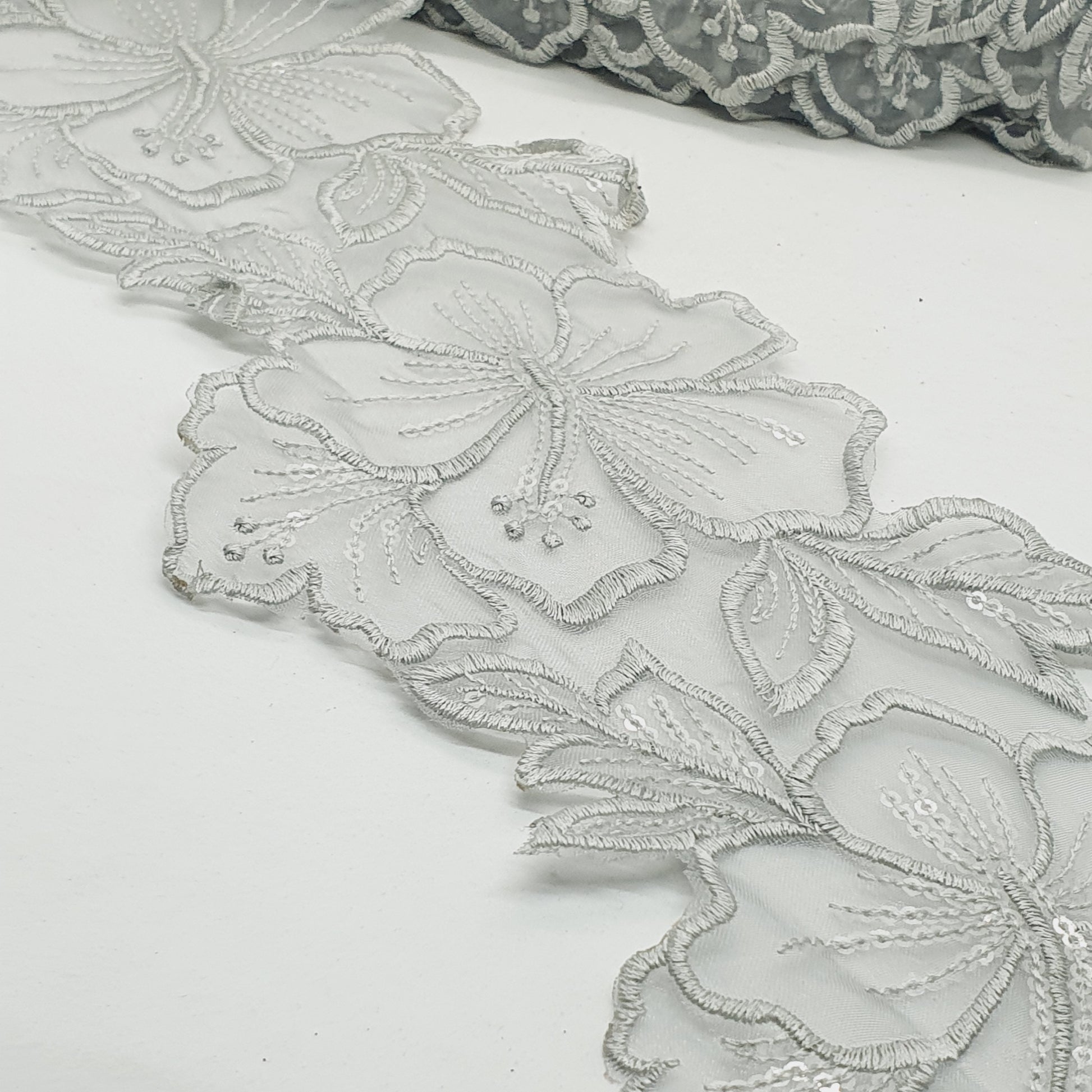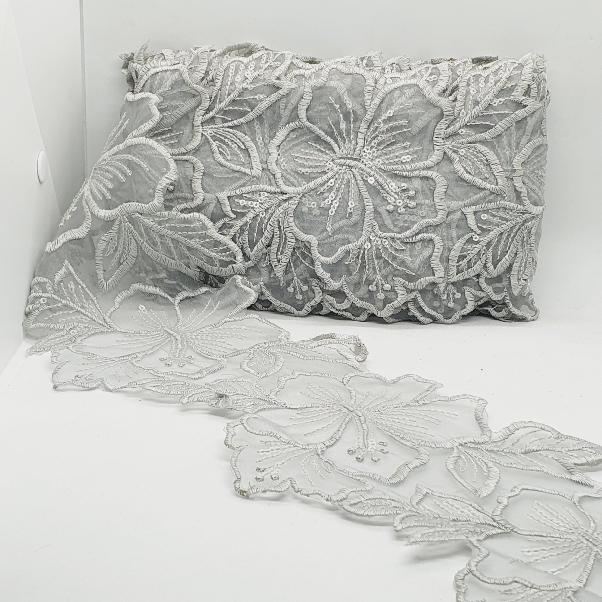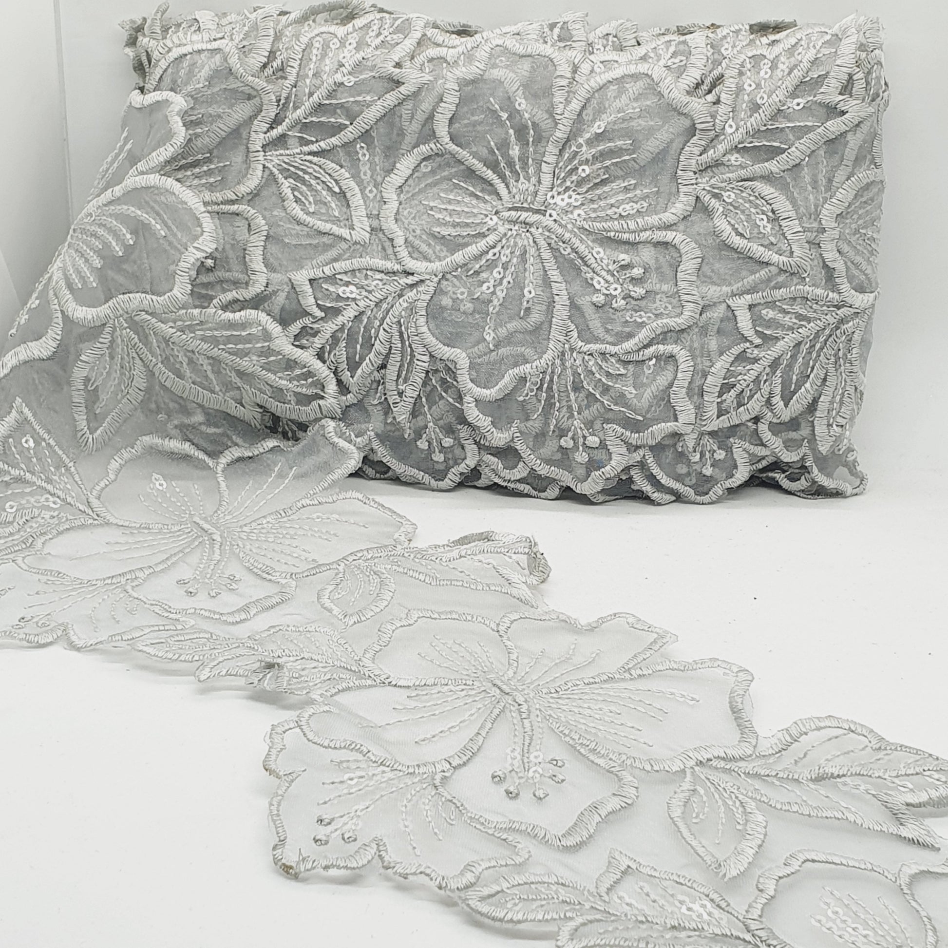 1m 14cm grey embroidered net floral lace with transparent sequins