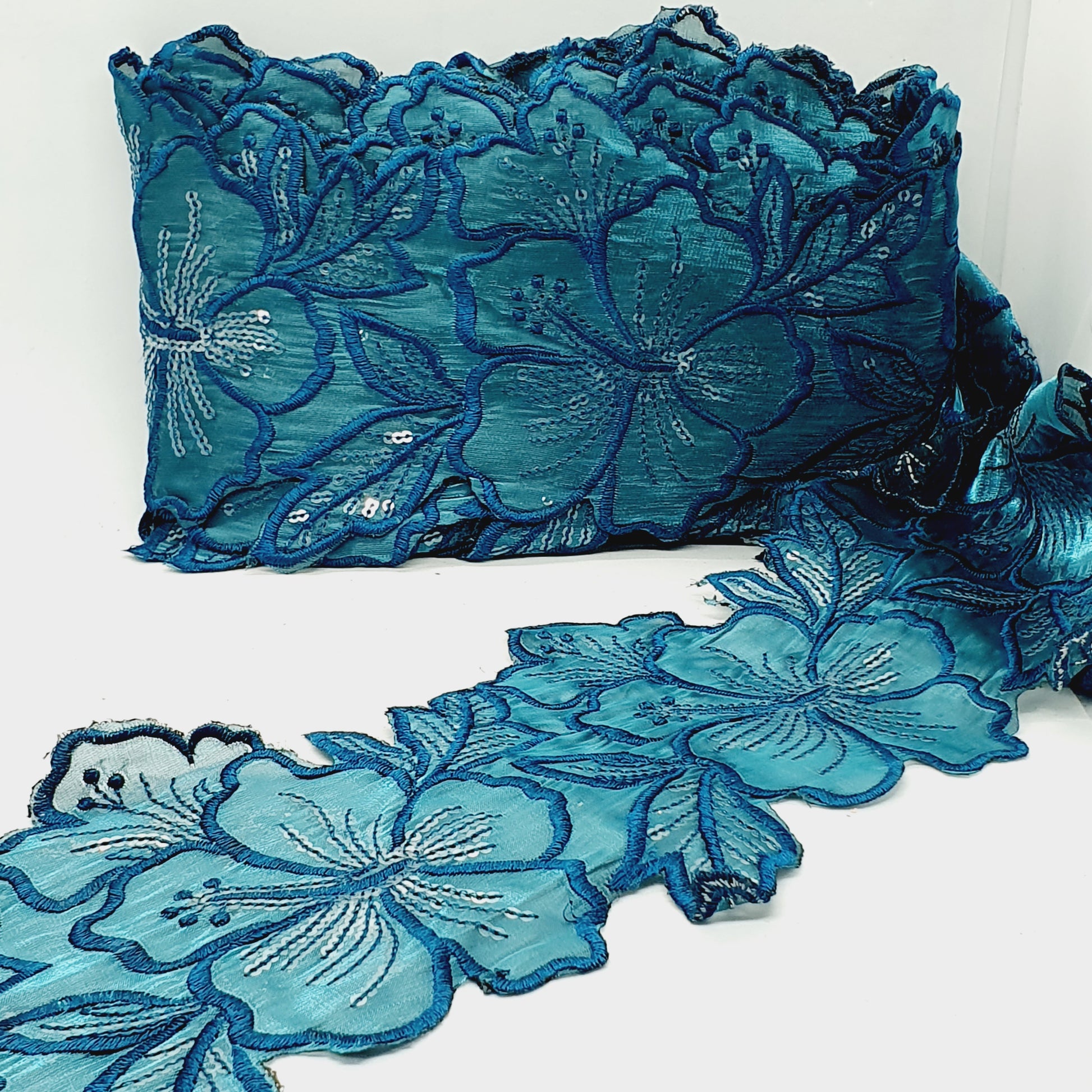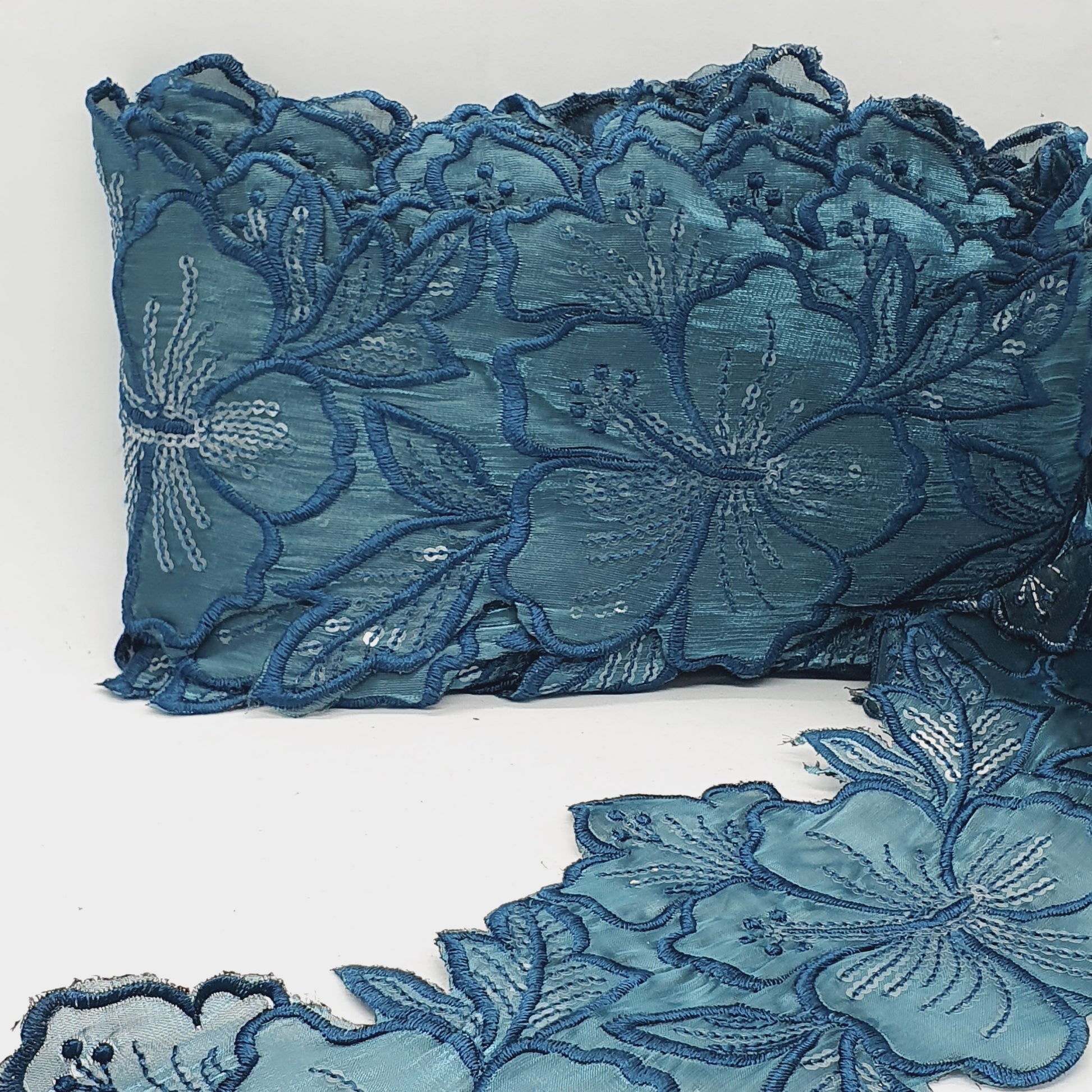 1m 14cm petrol teal embroidered net floral lace with transparent sequins