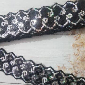 A beautiful net braid trim with black and silver hologram sequins. This is very beautiful in the flesh and would be stunning on clothing or soft furnishing and has enough shine from the sequins to be effective for stage wear trimming!