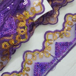 A beautiful net braid trim with purple and gold hologram sequins. This is very beautiful in the flesh and would be stunning on clothing or soft furnishing and has enough shine from the sequins to be effective for stage wear trimming!