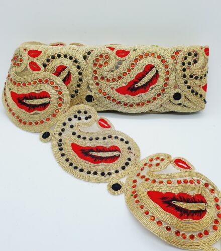 1m 6.5cm gold lace paisley applique with crystals: black & red