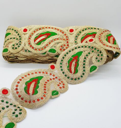 1m 6.5cm gold lace paisley applique with crystals: orange, green & red