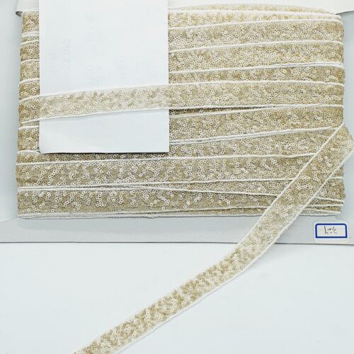 A beautiful sequinned net ribbon trim with a white base and matte gold sequins. This is very beautiful in the flesh and would be stunning on clothing or soft furnishing.