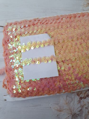 Peach AB elasticated stretch sequin trim. Perfect for costumes. 15mm wide Perfect for adding a touch of glamour and fun to any costume, this Peach AB Elasticated Stretch Sequin trim is an ideal choice for an unforgettable look!.