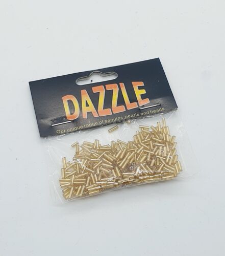Gold bugle beads. Perfect for use on clothing or for jewellery making. These beads really do add just enough sparkle to any project.