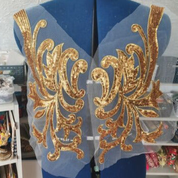 A beautiful gold lace applique with sequins in a scroll like design embroidered on white net.