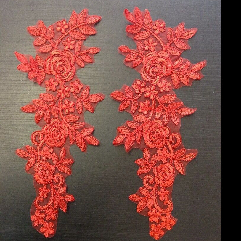 A beautiful pair of red embroidered lace appliques. Large enough to be a main decoration on a craft project or dress.