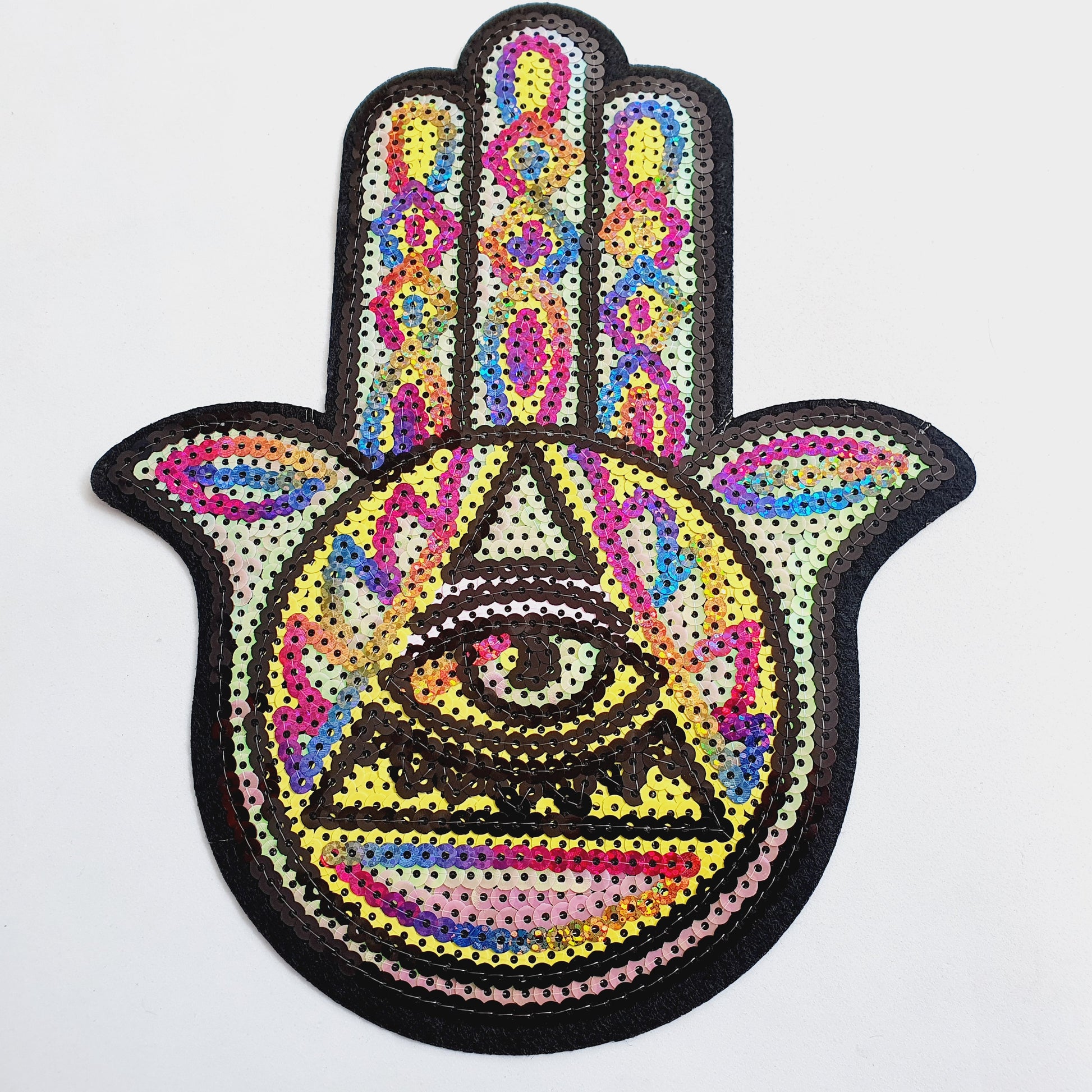 Transform any item into a work of art with this striking HAND OF FATIMA applique! Its vibrant multicoloured sequins and hotfix glue backing make it easy to attach to any fabric, adding a touch of elegance to your home decor or wardrobe.