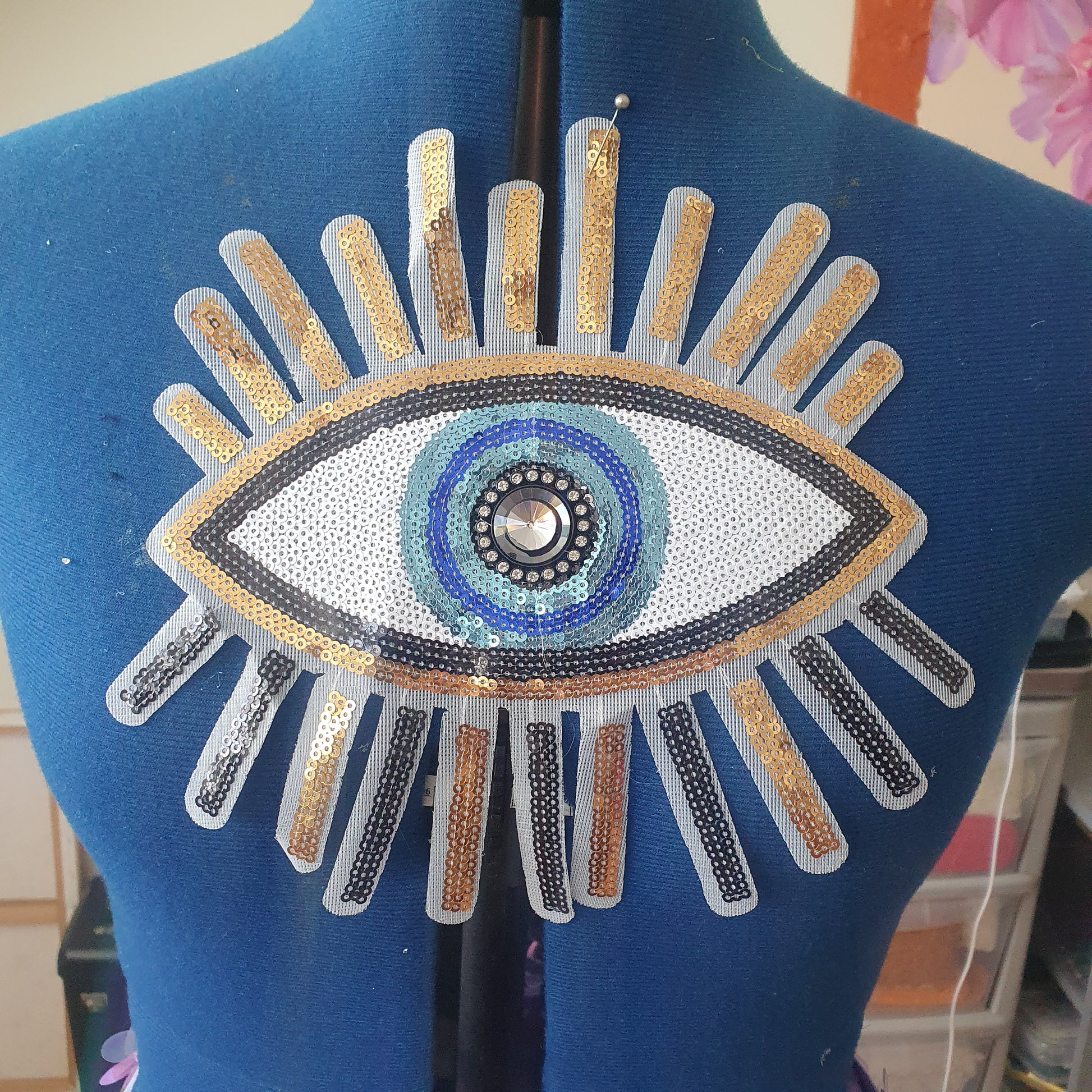A beautiful Turkish style Nazar/ Evil Eye applique with sequins snd a central jewel. There is a hotfix glue on the back so it can be ironed or sewn (instructions provided)