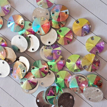 8mm sew on round shaped gems in super sparkly clear AB. Perfect for dance costumes or formal dresses. VERY SPARKLY.