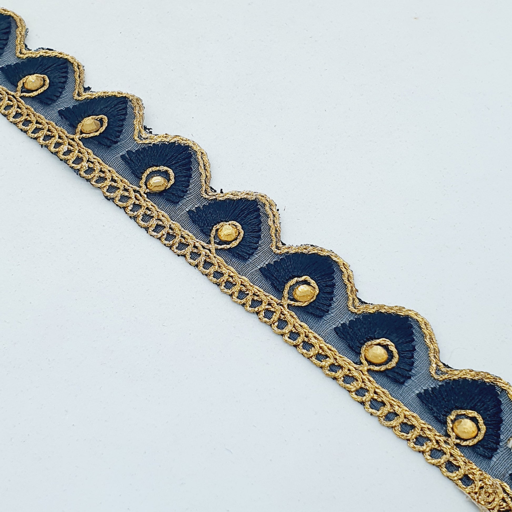 Beautiful Indian trimming with metallic gold detailing with black embroidered pattern and golden crystals. Ideal for furnishings and clothing. It measures approx 2.5cm wide (25mm) and comes in 1 meter lengths. Transform any ordinary piece into a stunning masterpiece with this trimming. Perfect for adding a touch of opulence to furnishings and clothing alike. The intricate gold detailing and rich colour will elevate your designs to the next level.