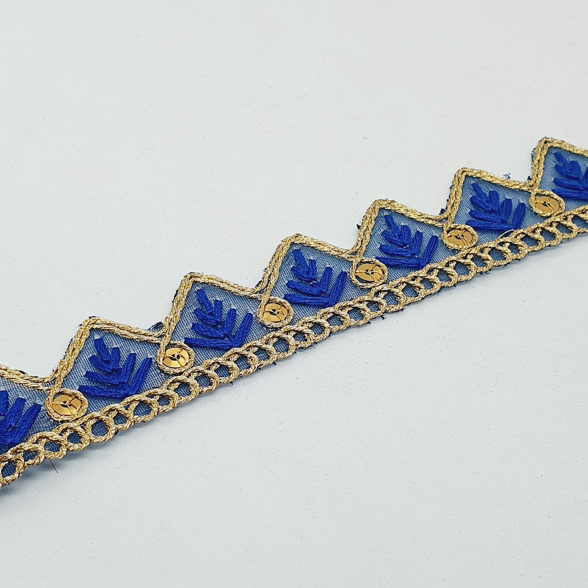 Beautiful Indian trimming with metallic gold detailing with dark blue embroidered pattern and golden sequins. Ideal for furnishings and clothing. It measures approx 2.5cm wide (25mm) and comes in 1 meter lengths. Transform any ordinary piece into a stunning masterpiece with this trimming. Perfect for adding a touch of opulence to furnishings and clothing alike. The intricate gold detailing and rich colour will elevate your designs to the next level.