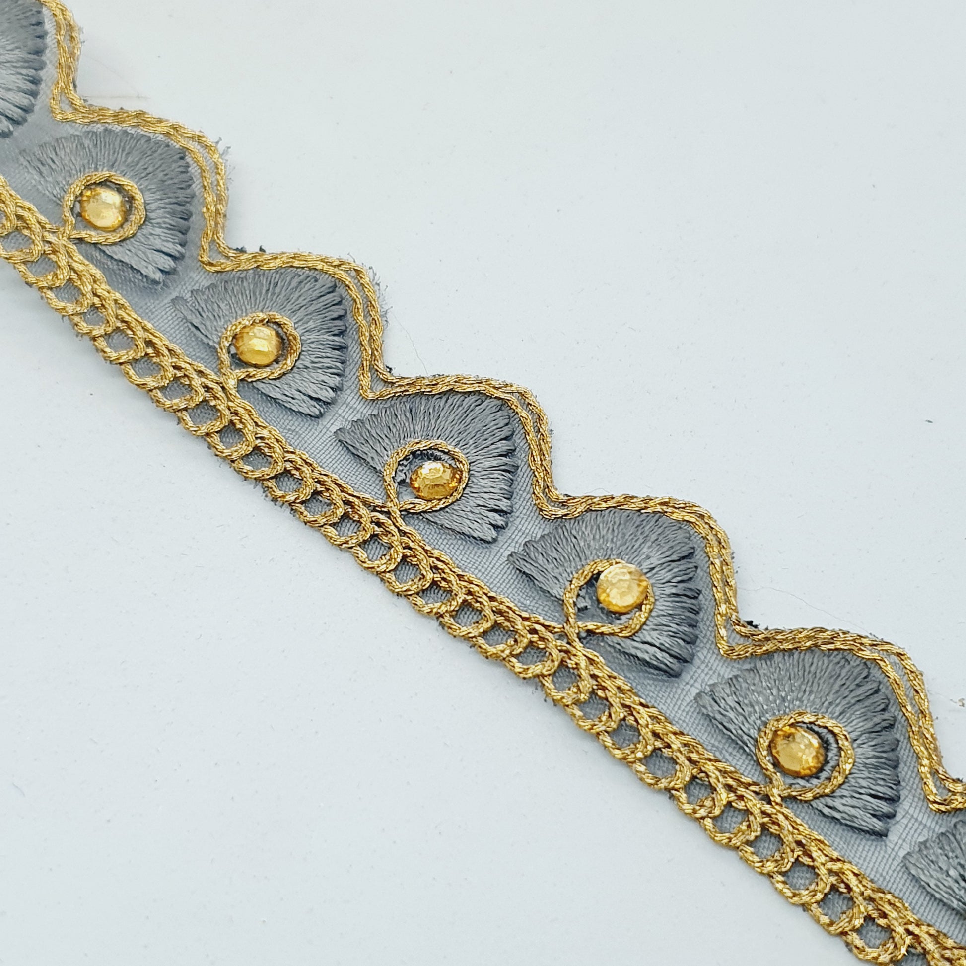 Beautiful Indian trimming with metallic gold detailing with grey embroidered pattern and golden crystals. Ideal for furnishings and clothing. It measures approx 2.5cm wide (25mm) and comes in 1 meter lengths. Transform any ordinary piece into a stunning masterpiece with this trimming. Perfect for adding a touch of opulence to furnishings and clothing alike. The intricate gold detailing and rich colour will elevate your designs to the next level.