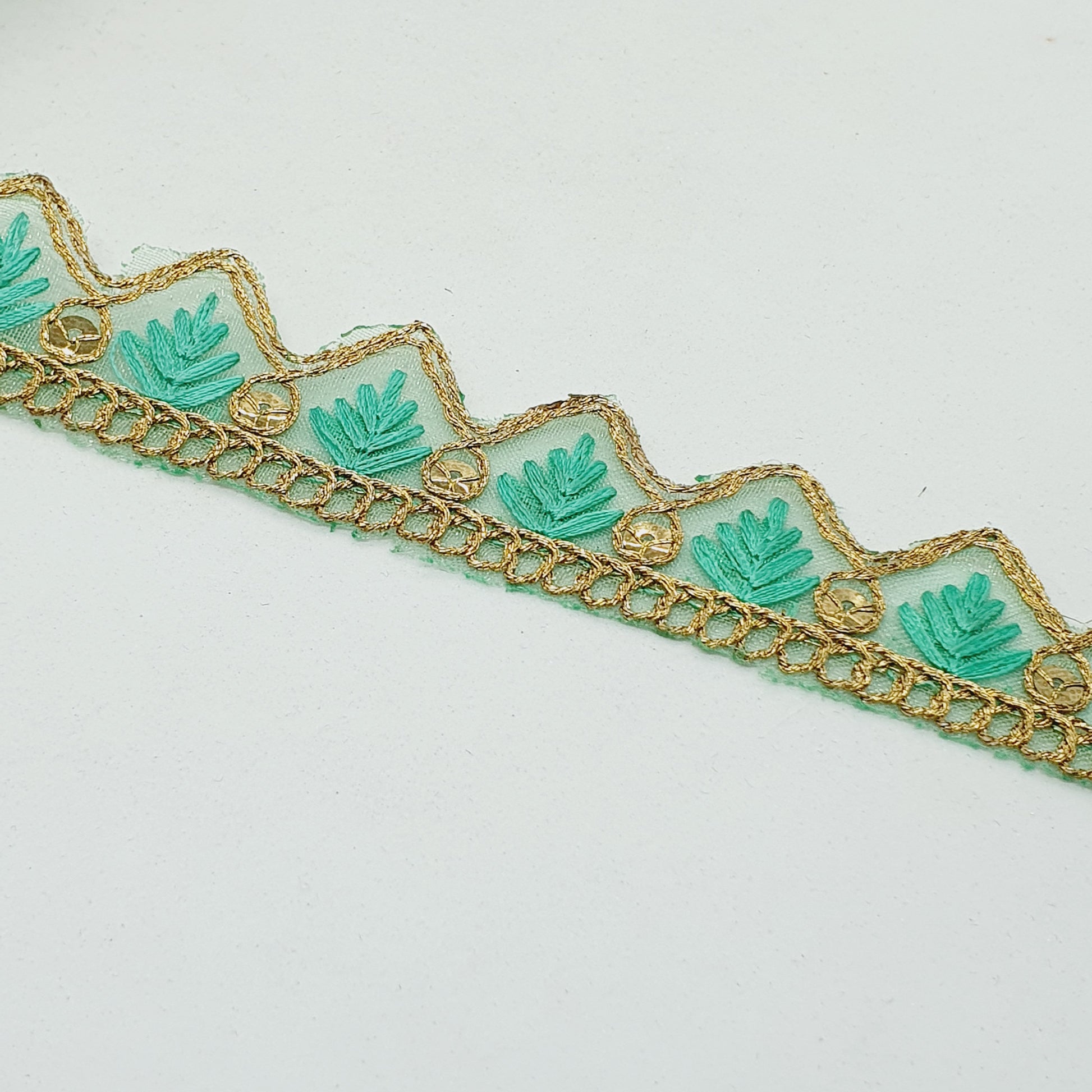 Beautiful Indian trimming with metallic gold detailing with mint green embroidered pattern and golden sequins. Ideal for furnishings and clothing. It measures approx 2.5cm wide (25mm) and comes in 1 meter lengths. Transform any ordinary piece into a stunning masterpiece with this trimming. Perfect for adding a touch of opulence to furnishings and clothing alike. The intricate gold detailing and rich colour will elevate your designs to the next level.