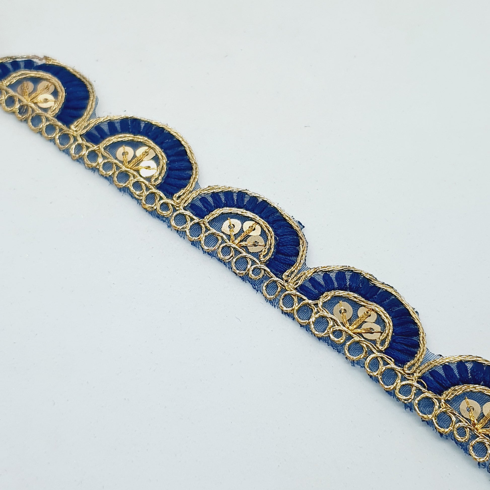 Beautiful Indian trimming with metallic gold detailing with navy blue embroidered pattern and golden sequins. Ideal for furnishings and clothing. It measures approx 2.5cm wide (25mm) and comes in 1 meter lengths. Transform any ordinary piece into a stunning masterpiece with this trimming. Perfect for adding a touch of opulence to furnishings and clothing alike. The intricate gold detailing and rich colour will elevate your designs to the next level.