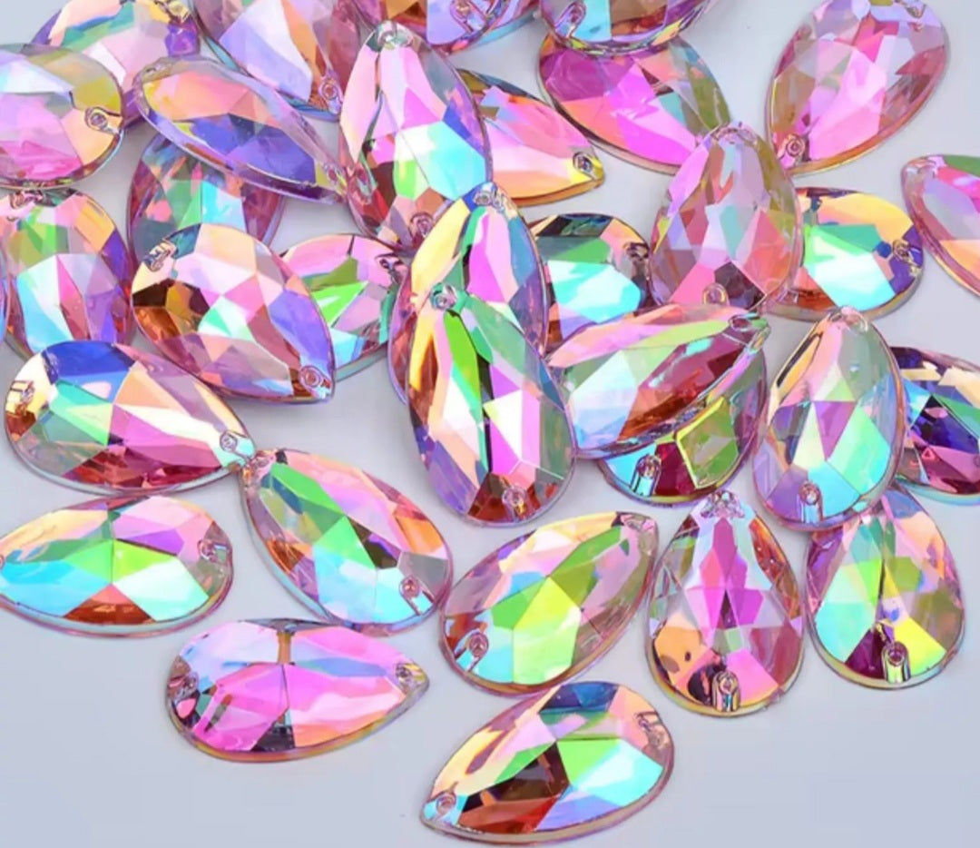 18mm x 28mm sew on tear drop shaped gems with a faceted surface in pink AB. Perfect for dance costumes or formal dresses.