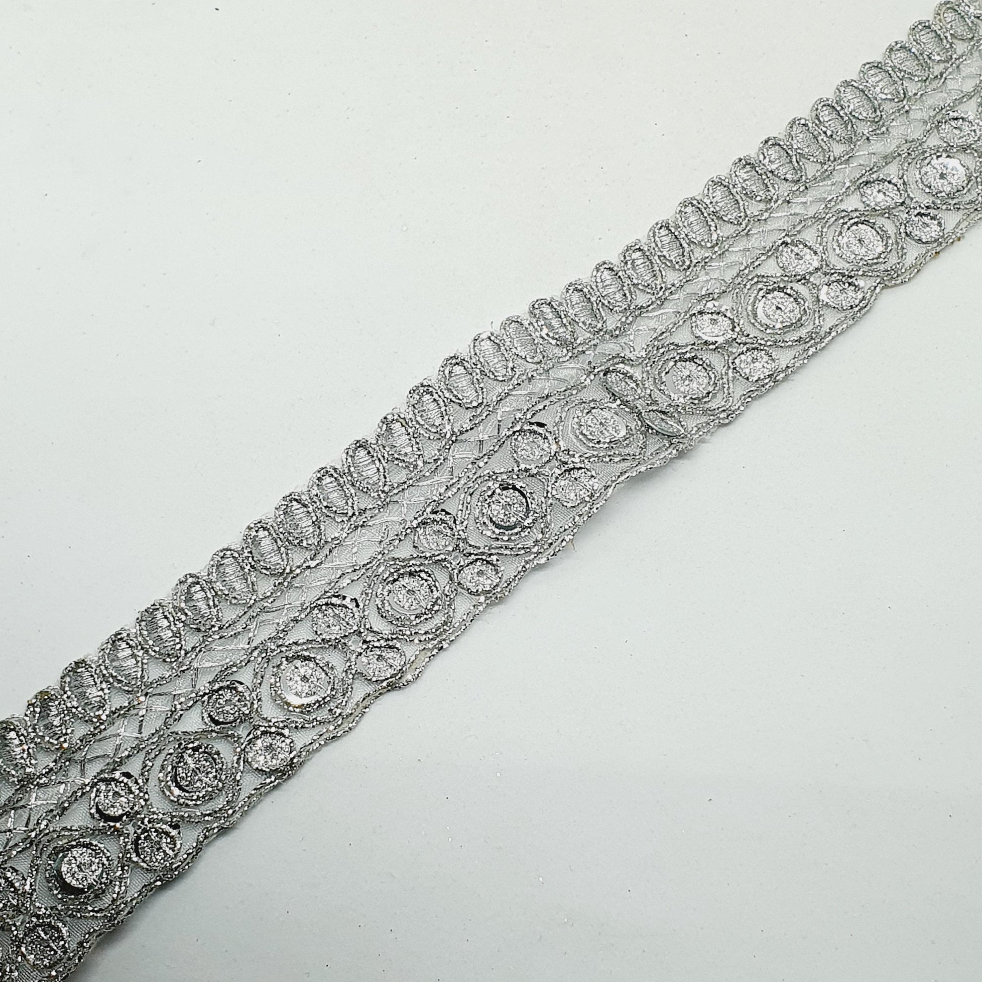 Beautiful Indian trimming with metallic silver detailing and glitter sequins. Ideal for furnishings and clothing. It measures approximately 4cm wide (40mm) and comes in 8 meter lengths. Transform any ordinary piece into a stunning masterpiece with this trimming. Perfect for adding a touch of opulence to furnishings and clothing alike. The intricate gold detailing and rich colour will elevate your designs to the next level.