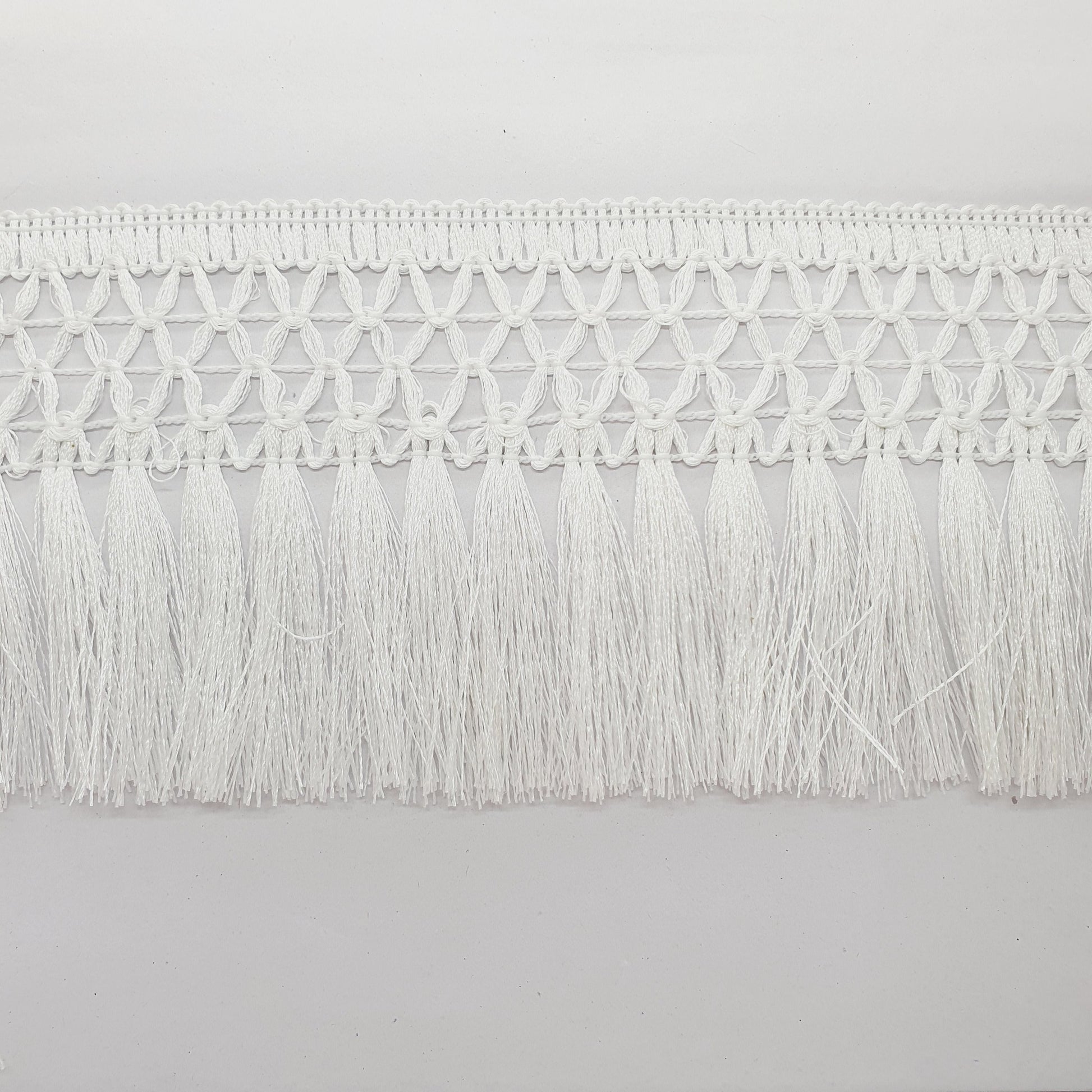 A lovely tassel fringing in white. Adds drama and movement. Get ready to elevate any outfit with the mesmerizing 9cm drop fringing. This fringing is sure to add a touch of glamour and movement to your wardrobe. Ideal for clothing or soft furnishings.