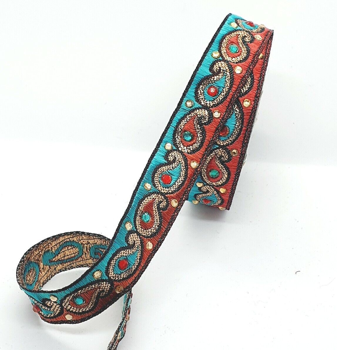 1m 20mm teal rust gold metallic embroidered CRYSTAL ribbon