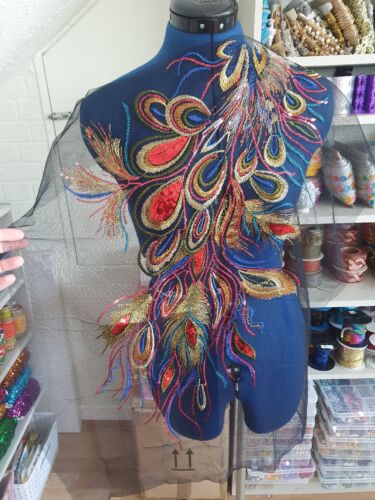 1x black net gold sequin MULTI COLOUR peacock feather embroidered lace applique